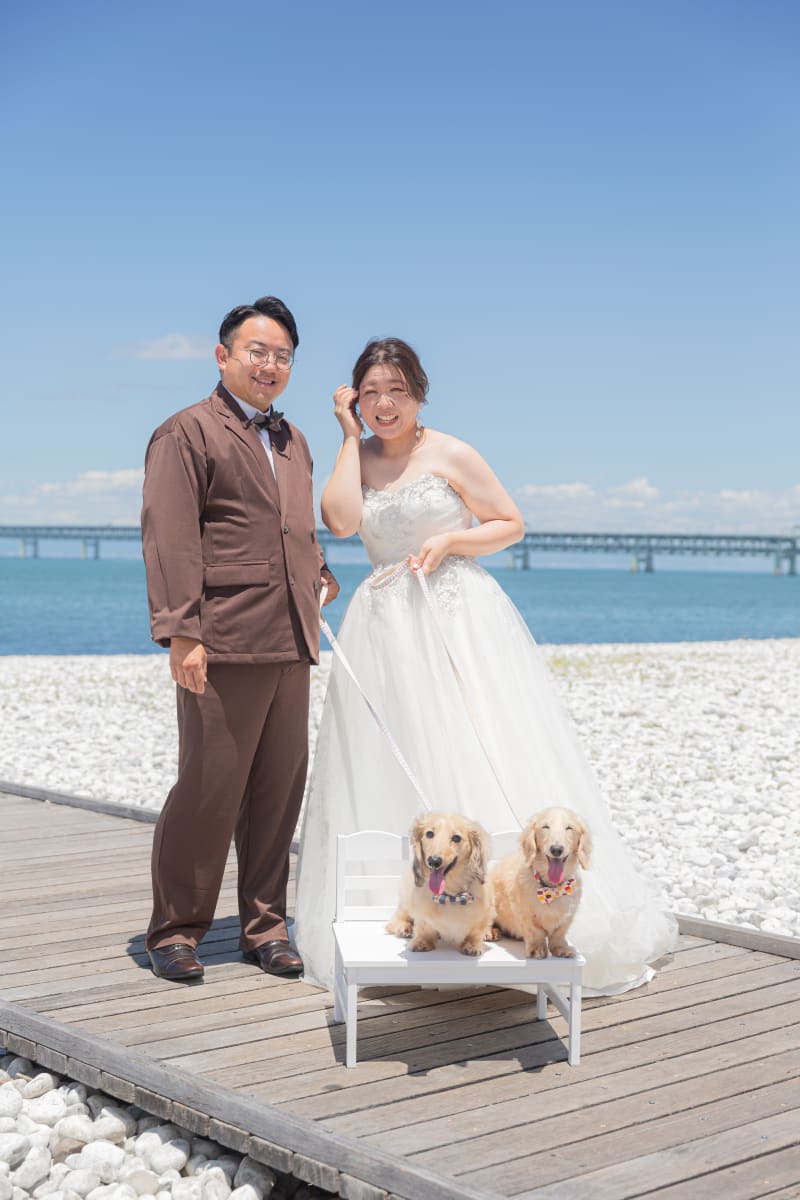 愛らしいワンちゃんたちも一緒に記念撮影。みんなで幸せを分かち合った、温かい集合写真です