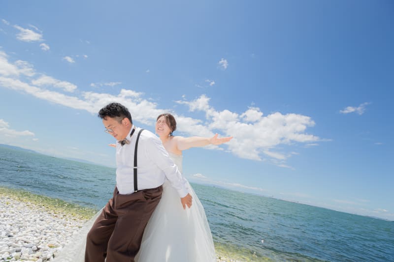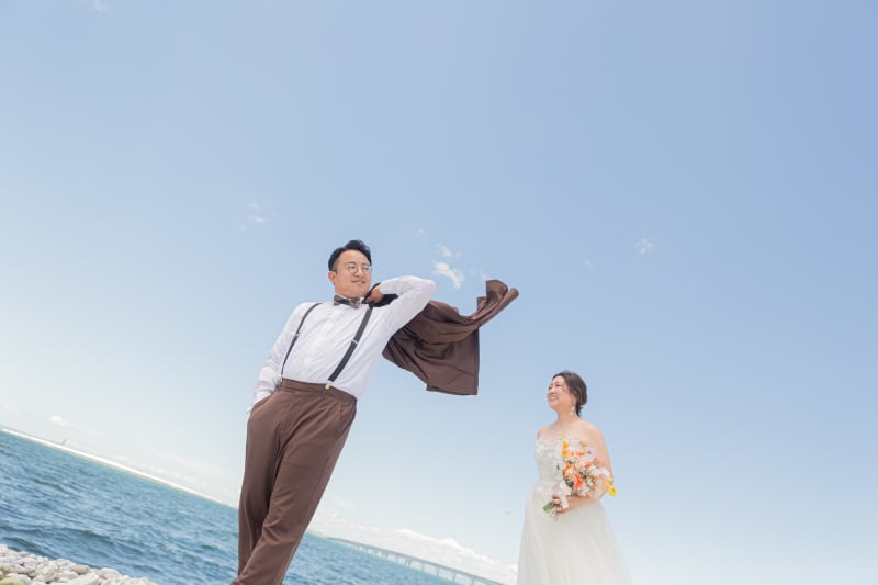 太陽の下、まるで空を飛んでいるかのような遊び心あふれるポーズ!お二人の仲の良さと、楽しそうな笑い声が聞こえてきそうな一枚です!!!