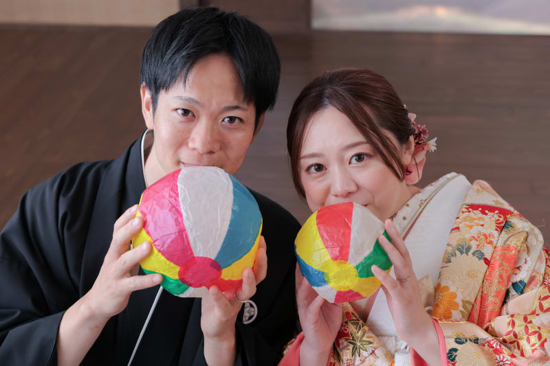 持ち込みいただいた紙風船をお二人で膨らませてもらいました。