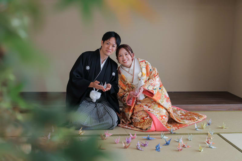 時間をかけて作ってきてくださった折り鶴がとても可愛く素敵な写真になりました。