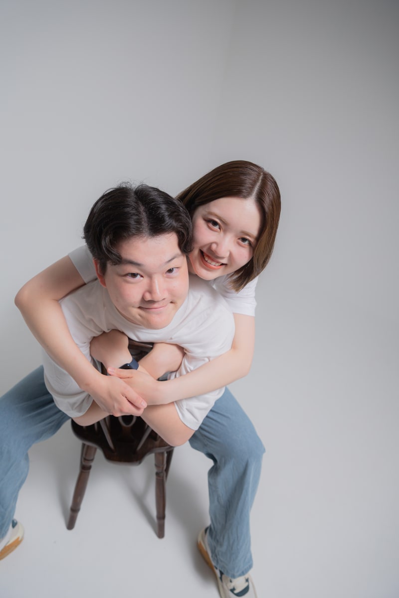 新郎様が椅子に座り、新婦様が後ろからハグをするカットでは、お二人とも弾けるような笑顔を見せてくれました!