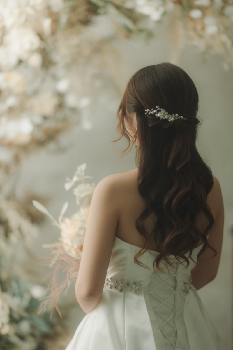 こちらの新婦様からいただいた「可愛すぎないハーフアップ」のご希望に合わせて、カール感を抑えてつつ毛先に動きを出したスタイルにしてみました!!ウェディング感もあり落ち着いた印象でとても素敵です!⭐️