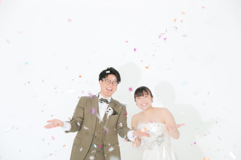 中でも印象的だったのは、ライブ会場で手に入れた銀テープを小さくカットして作られたコンフェッティ。きらきらと舞う様子がとても華やかで、お二人らしさがぎゅっと詰まった素敵なお写真になりました。