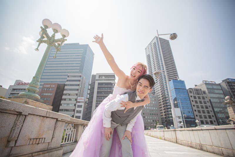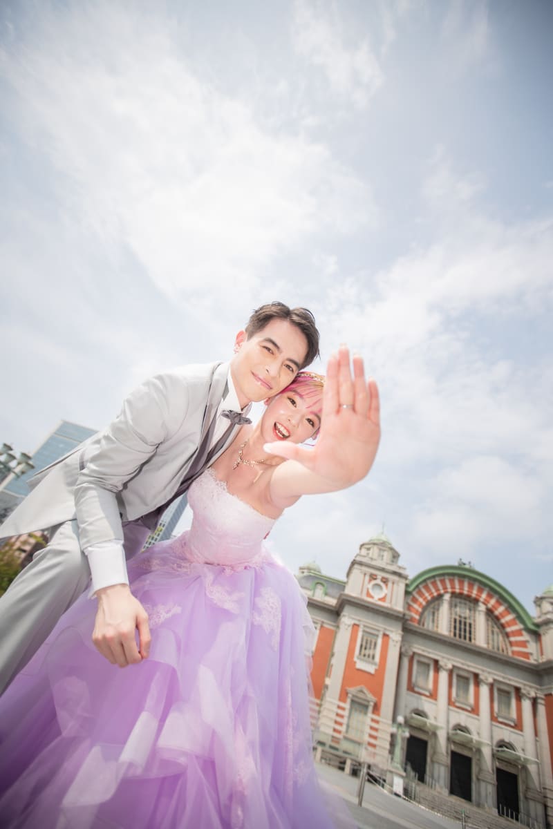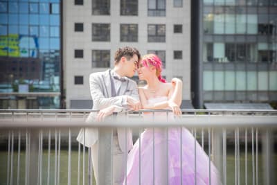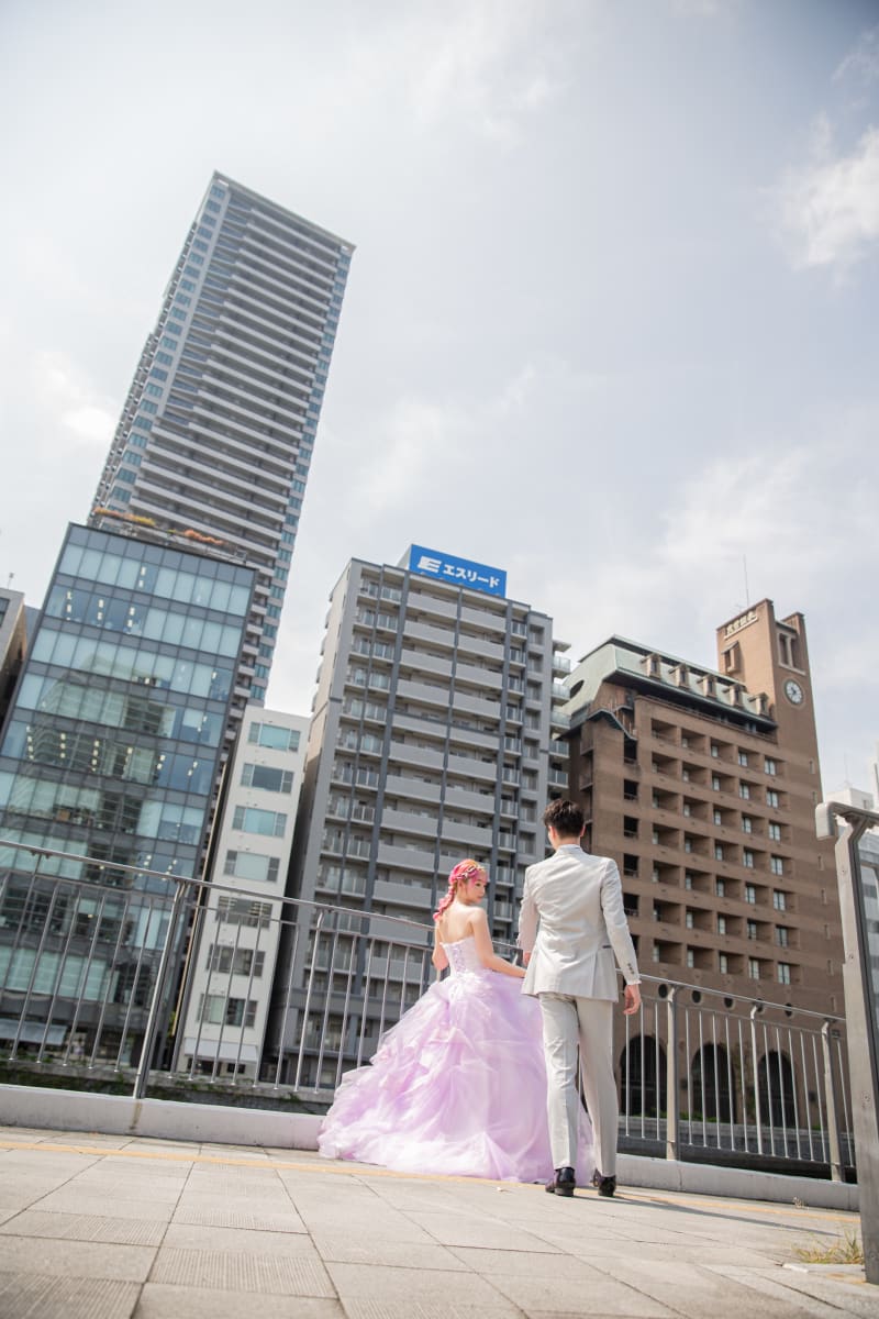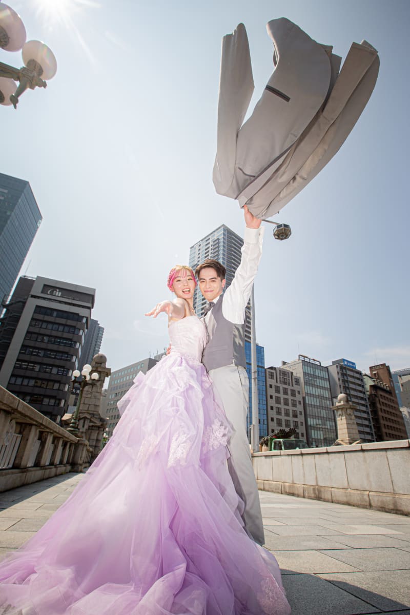 余白を楽しむカット、都会に映えるパープルドレス、そしてふとした瞬間のコミカルな動き。そのミックスが“おしゃれ”でありながら、どこか肩の力の抜けたおふたりらしさを映していました。一枚一枚がまるで物語のような仕上がり。未来のおふたりにとって、この日の写真が大切な宝物となりますように