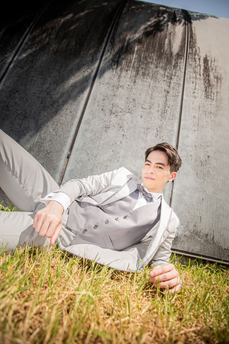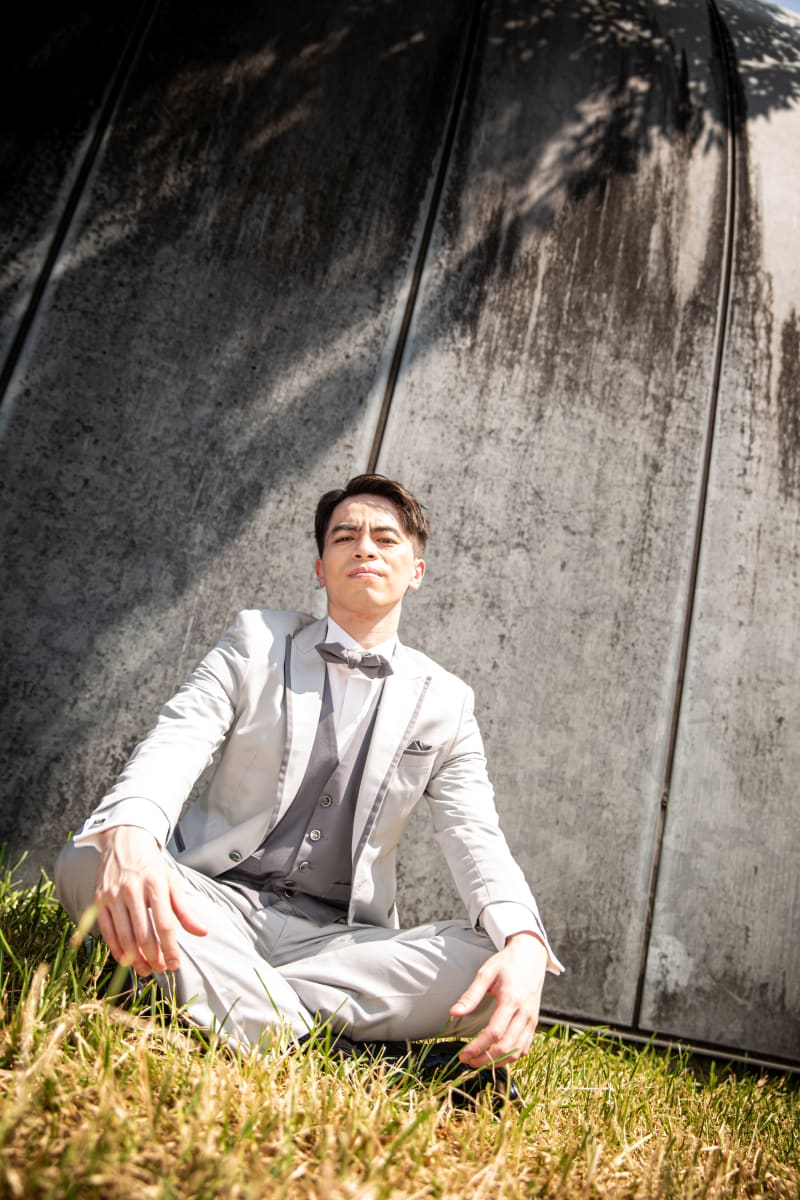 パープルドレスの花嫁さまとは対照的に、シンプルなタキシードを纏った新郎さま。ただ立つだけではなく、表情やポージングに“余裕”を感じさせることで、まるでハイブランドの広告ポスターのような一枚に仕上がりました。