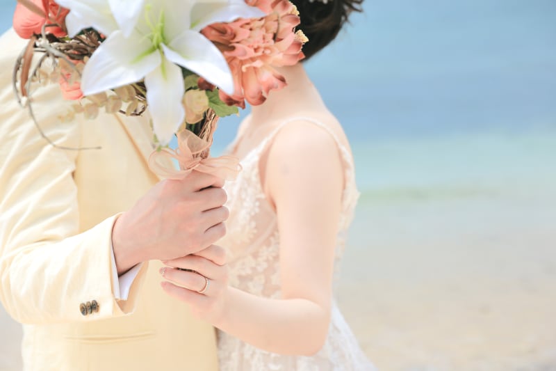 そして、可愛らしいピンクのブーケが、明るいビーチの景色に華を添え、新婦様の幸せな笑顔をより一層引き立てていますね。