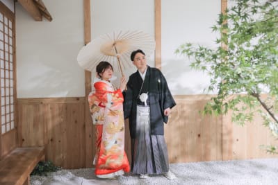 和装では「屋内庭園」での撮影。緑あふれる日本庭園を再現した空間で、落ち着いた雰囲気のお写真を残していただけます。