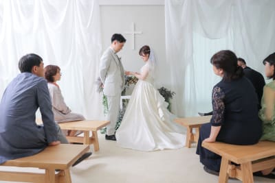 洋装は「チャペル」での撮影。温かな光に包まれる明るい空間で、華やかで特別感のあるシーンを演出できます。