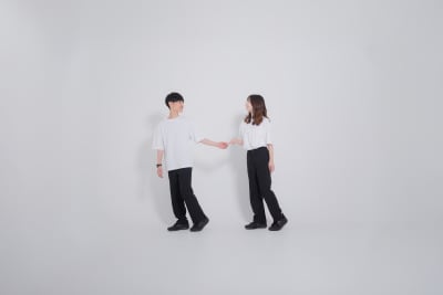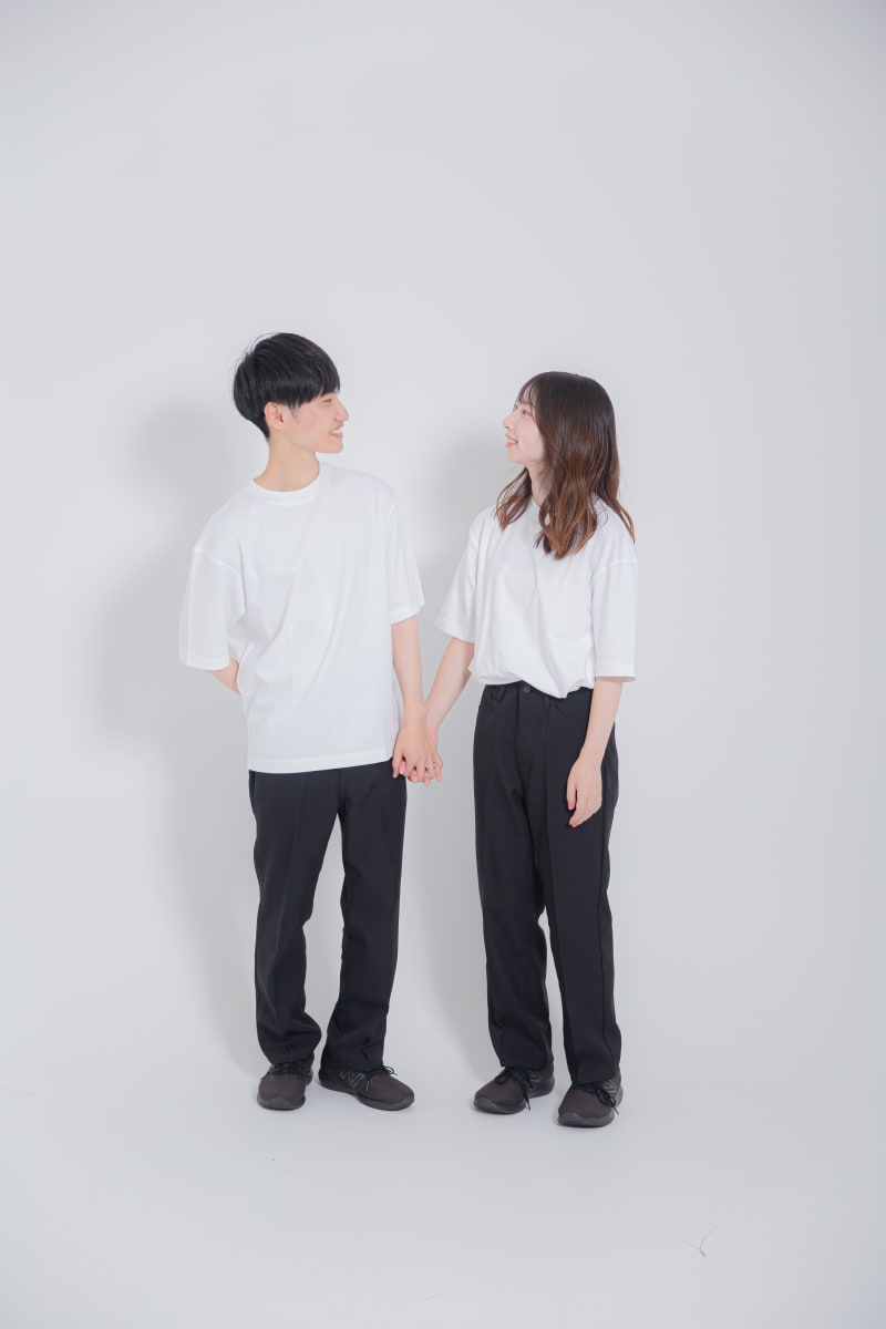 トップスもスニーカーもおそろいのペアルックで登場!リンクコーデがとっても可愛くて、撮影前からスタッフもほっこり♡