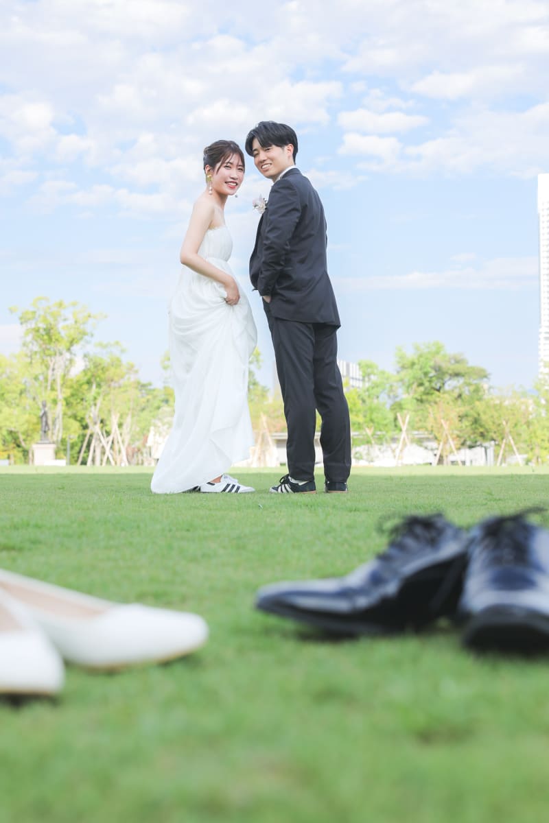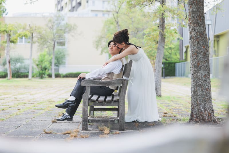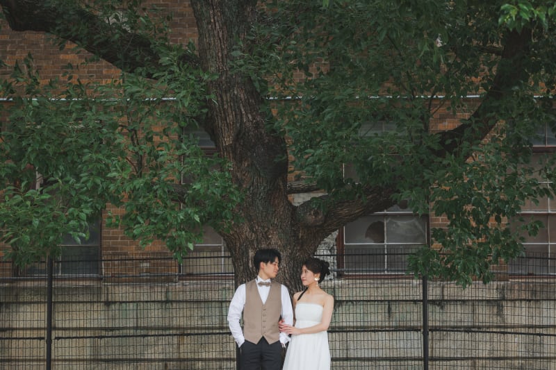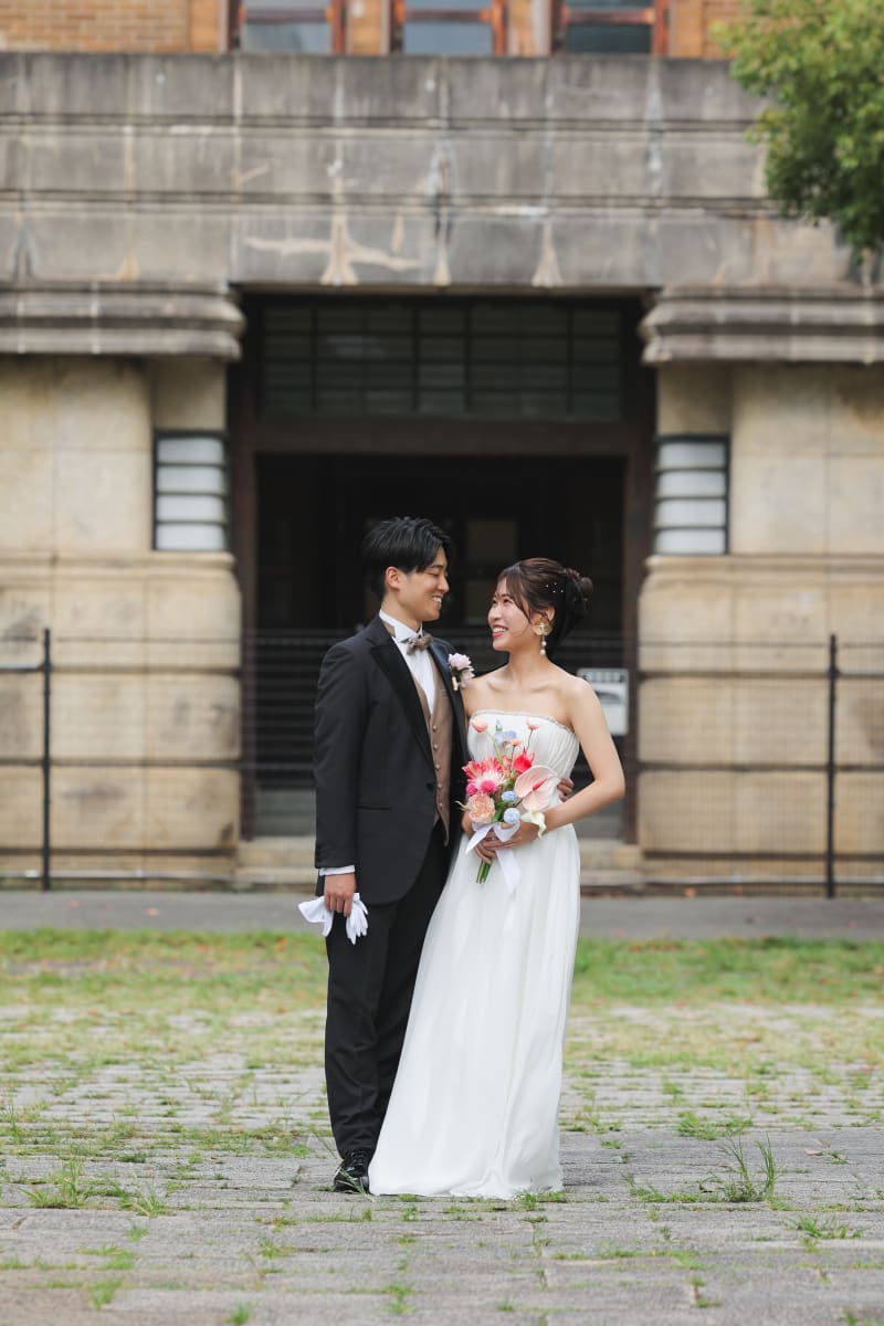 この日は、建物の壁を背景に少しクラシカルなポージングにも挑戦。和装にも合うロケーションなので、和洋どちらの衣装でもOKです。