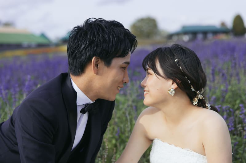 見つめ合ってもらいお花を背景にして!紫の花が背景で綺麗です◎