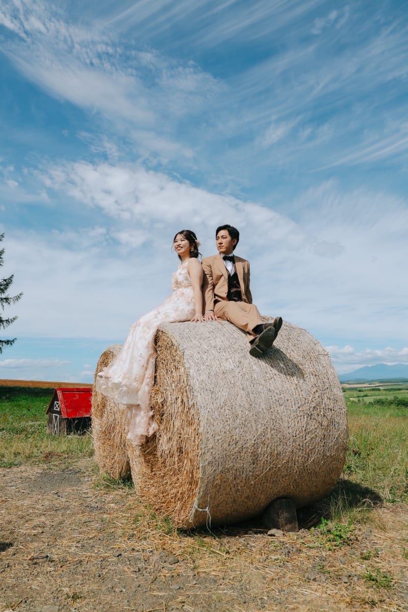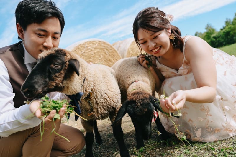 牧草ロールの上に座ったり、羊と戯れたりおふたりの自然な姿をパシャリ。