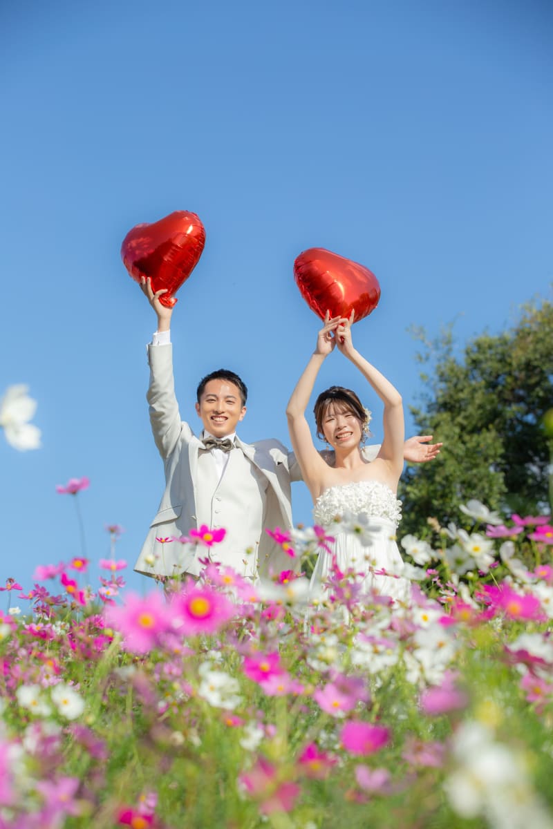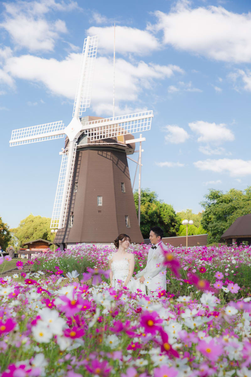 風にそよぐコスモスの中で、ドレスの裾をそっと広げて 2人で手を取ってゆらゆら。