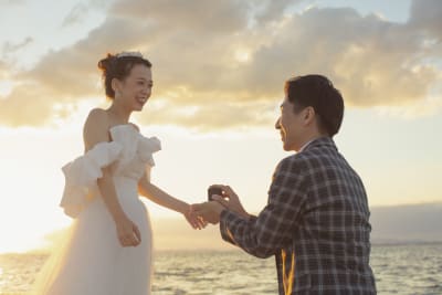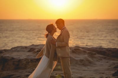 白いビーチのコントラストが非常に美しく、爽やかな洋装に最適。特に夕焼け時は、空