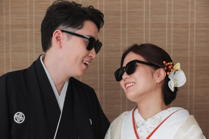 こちらはお持ち込みのサングラスを使用しての撮影。お二人らしいアイテムがあれば、より笑顔いっぱいの一枚に!