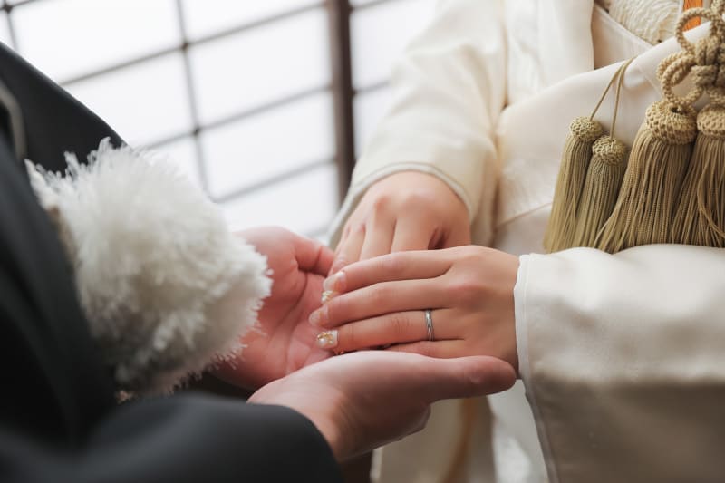 お二人の手元にクローズアップした一枚。薬指に光る指輪がキラキラと輝きます。