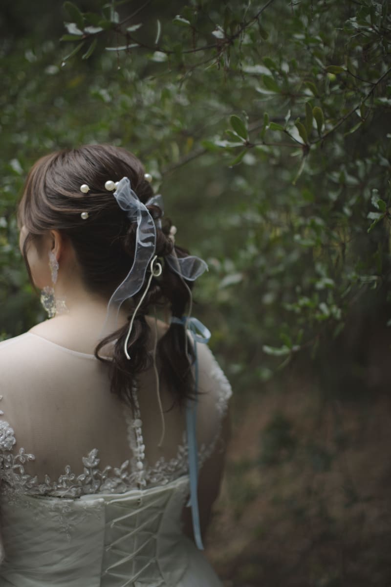 新婦様のヘアスタイルは編みおろしツインで、リクエストのリボンをたっぷり使ったスタイルに♪