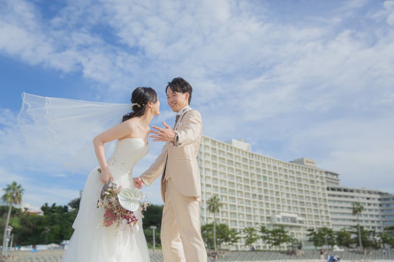 白良浜での前撮りは、まさに“国内で叶う海外リゾート”のような贅沢な時間。