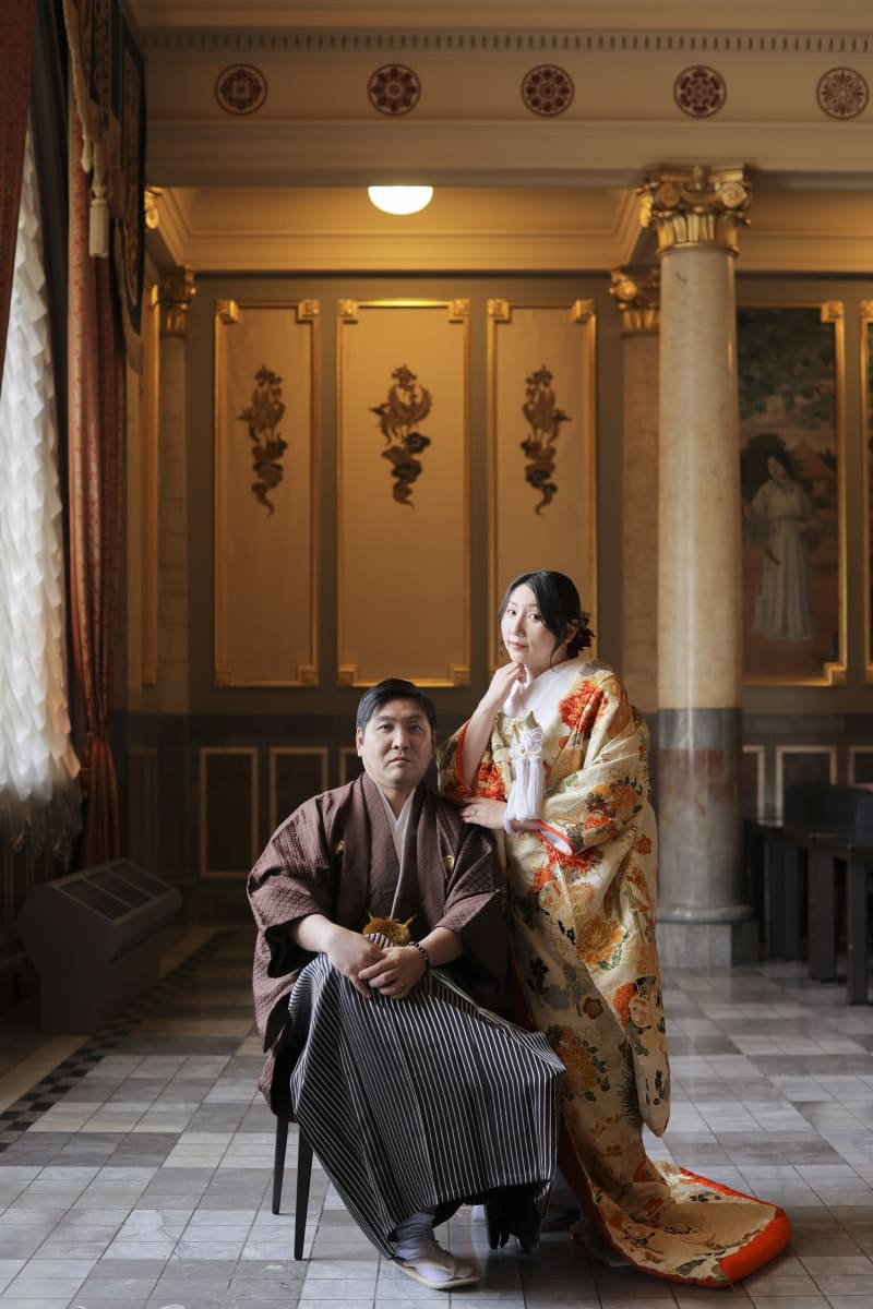 格式ある和装姿と建物のデザインが見事にマッチし、落ち着きと温かさを感じさせる仕上がりです。