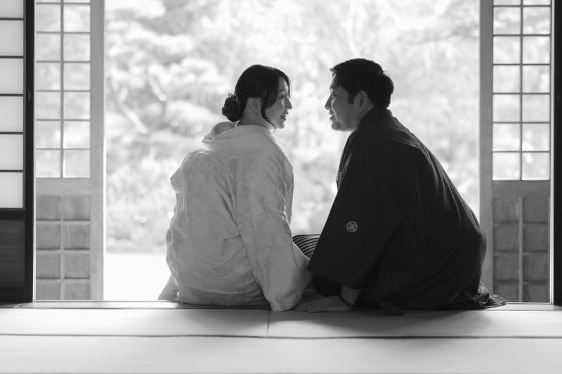 縁側に腰掛け、向かい合うお二人をモノクロで表現した一枚です。