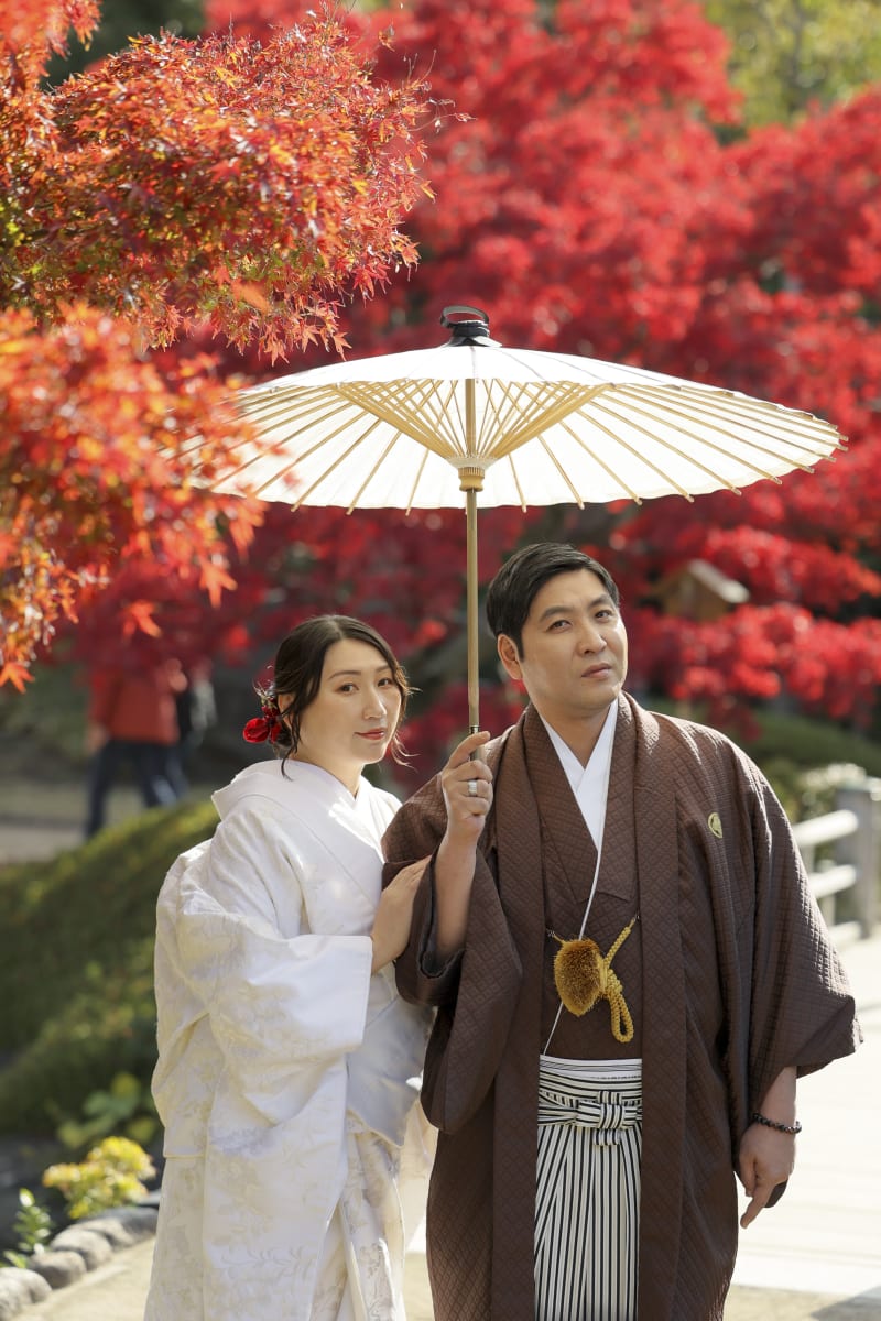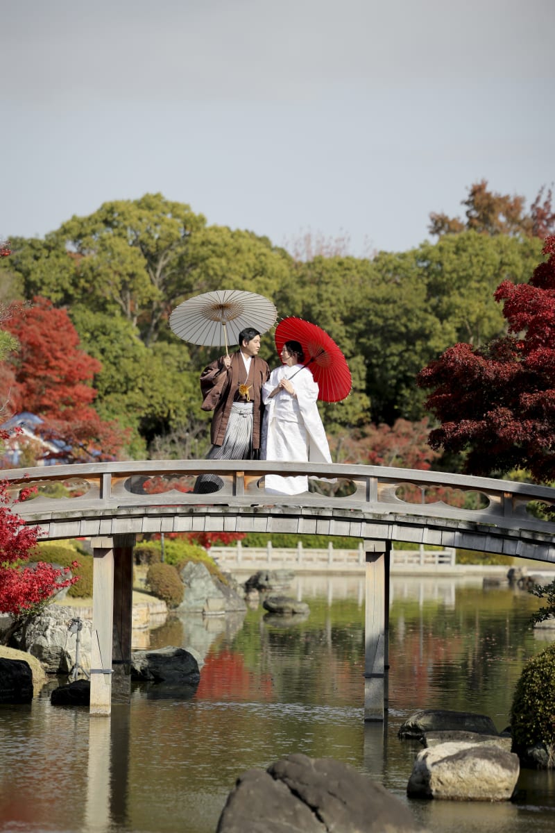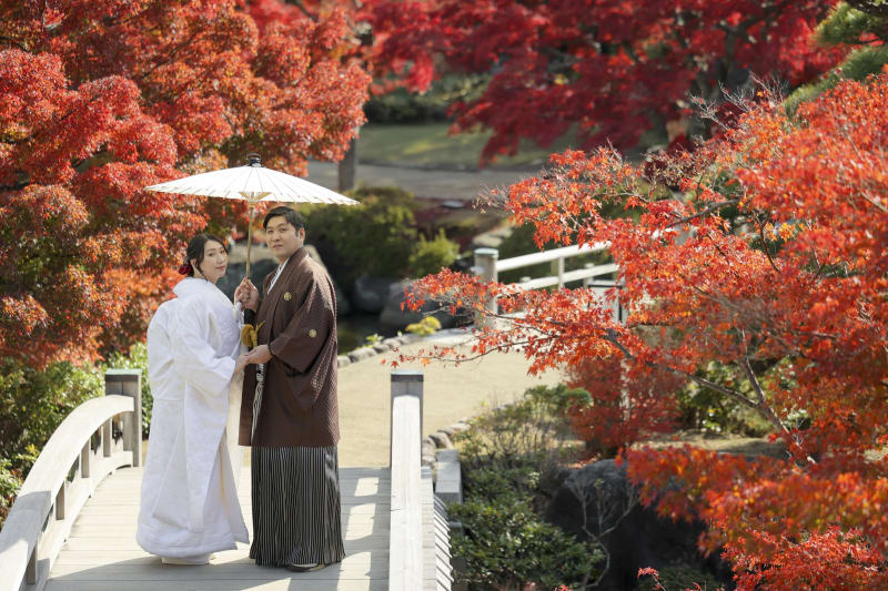 朱色に色づいた紅葉が広がる日本庭園の太鼓橋にて撮影を実施。