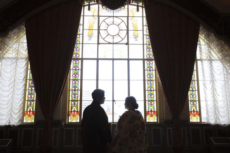 大きなステンドグラス窓を背景に、新郎新婦のシルエットを活かしたカットを撮影。