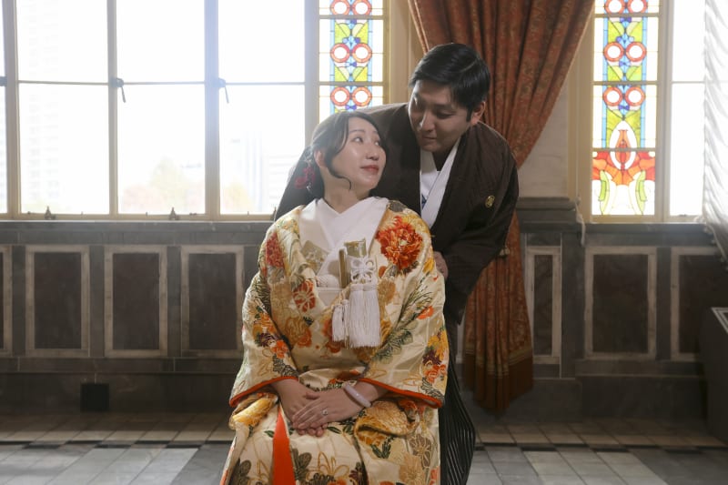 逆光を利用することで、お二人の距離感や静かな想いが際立ち、建物の歴史的な雰囲気と和装の美しさが調和した一枚となっています。クラシカルでありながら、印象に残る撮影が実現しました。