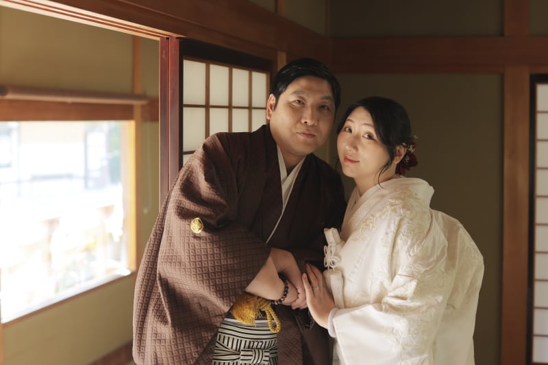格子戸と柔らかな自然光に包まれた室内にて、ご新郎様とご新婦様が寄り添う一枚です。