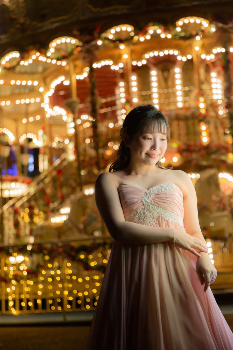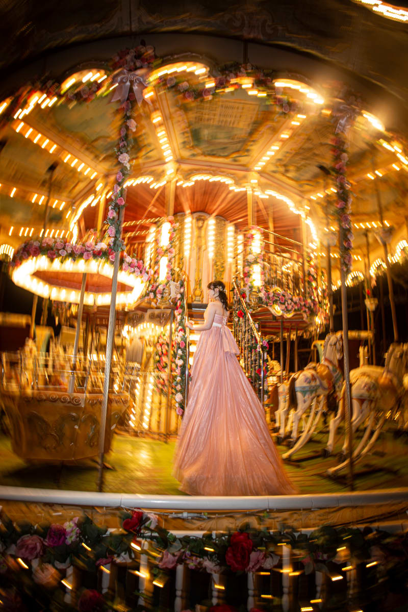 回転するメリーゴーランドの光に包まれながら、まるで物語の主人公のように佇む新婦様。