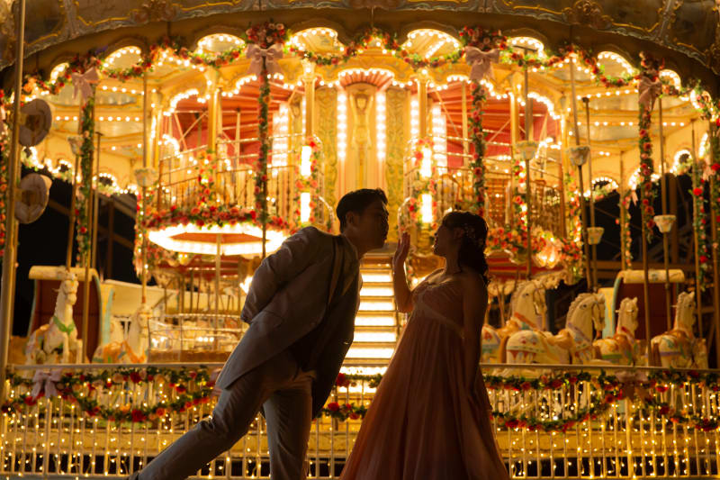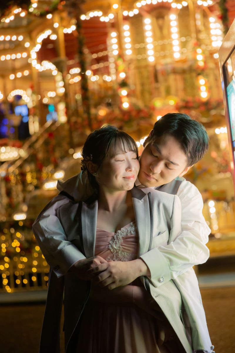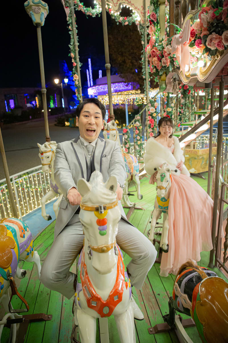 夜の遊園地に灯る無数の光の中、メリーゴーランドに乗って無邪気に笑うおふたり。