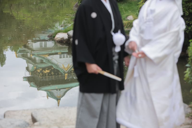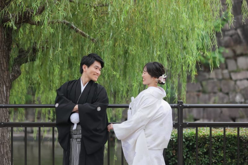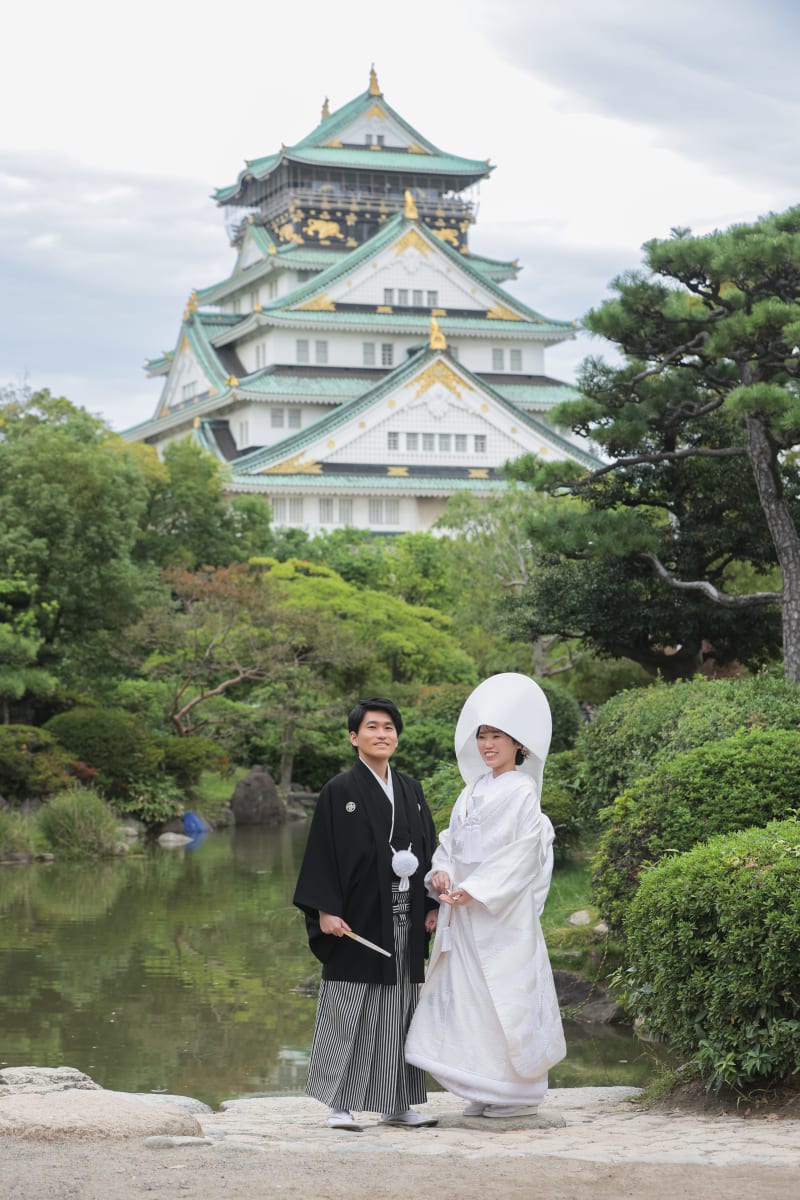 先に洋装をなんばパークス店のチャペルスタジオで撮り、お色直ししてから大阪城で和装を撮影しました。
