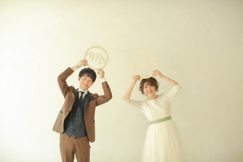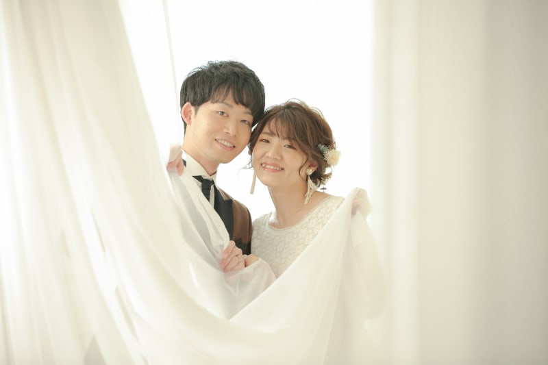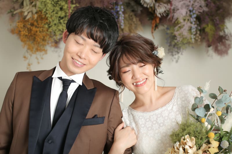 シンプルな背景で、おふたりの幸せな表情を主役にした一枚を