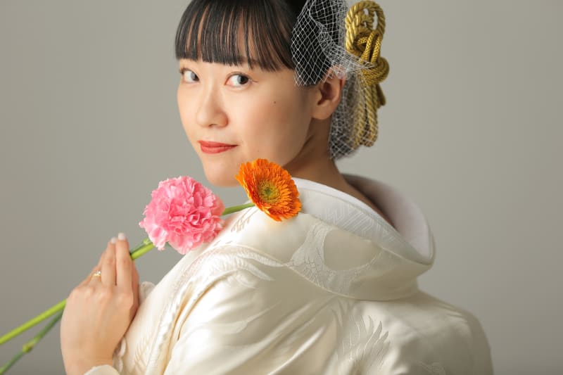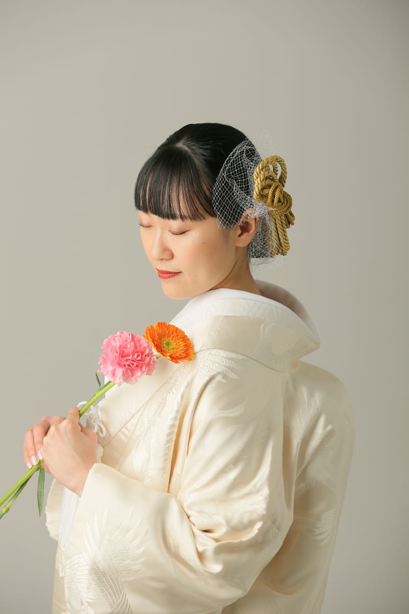大胆な髪飾りに負けない新婦様の眼差しに惹き込まれますね…!