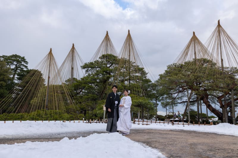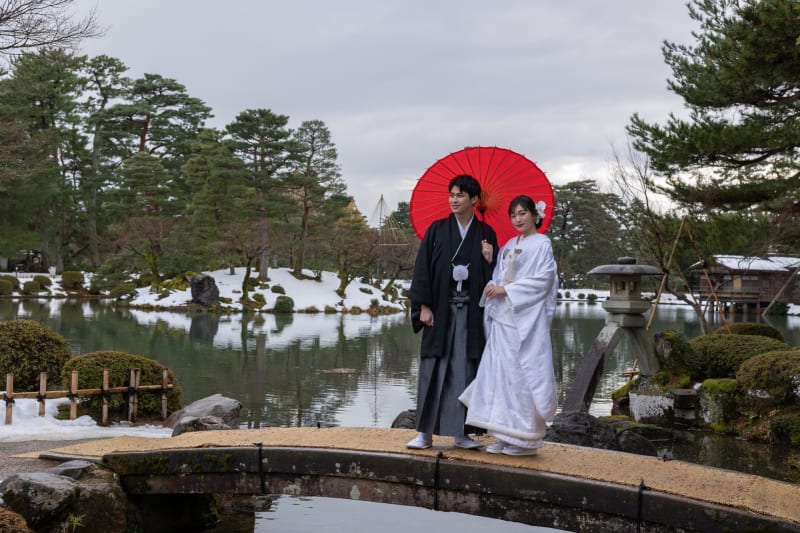 この時期だけの冬の雪吊りが美しい兼六園や金沢駅の鼓門など、金沢らしい景色の中で、お得にウェディングフォト撮影をお楽しみいただけます。