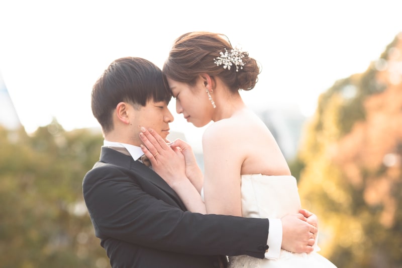 シンプルな背景で、おふたりの幸せな表情を主役にした一枚を