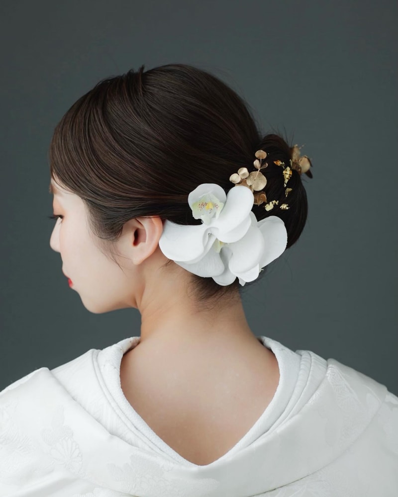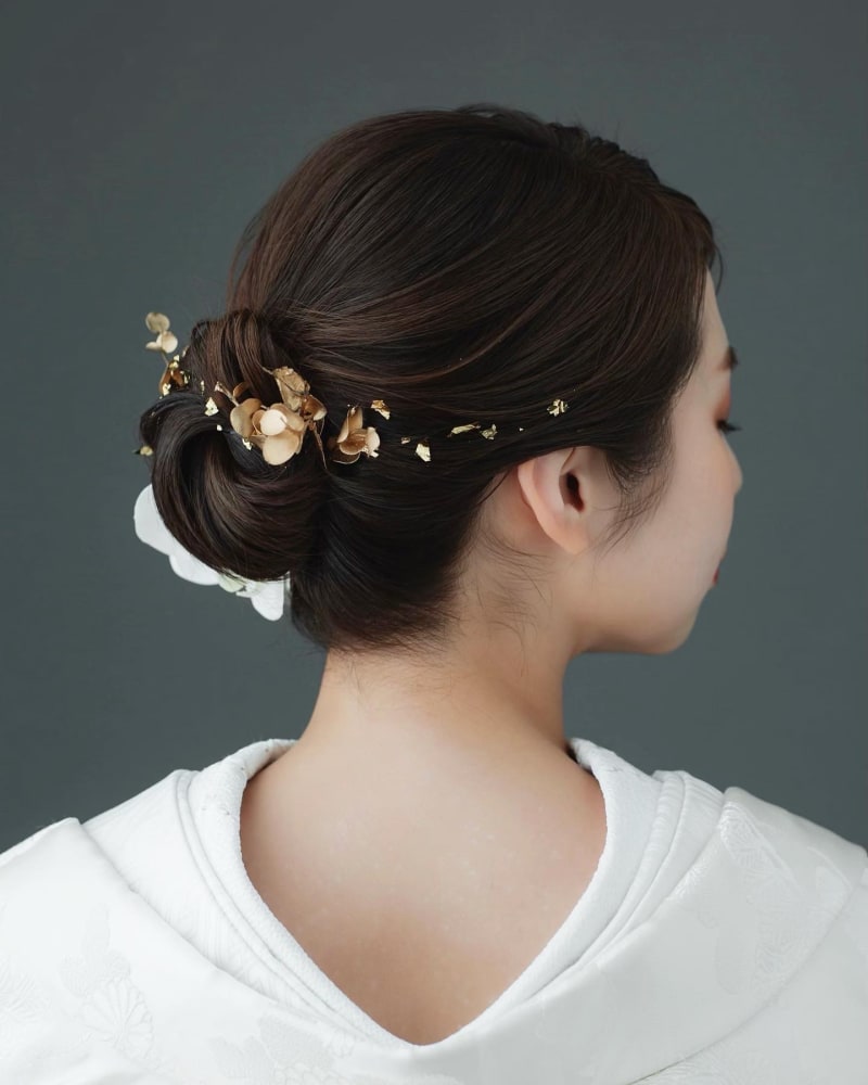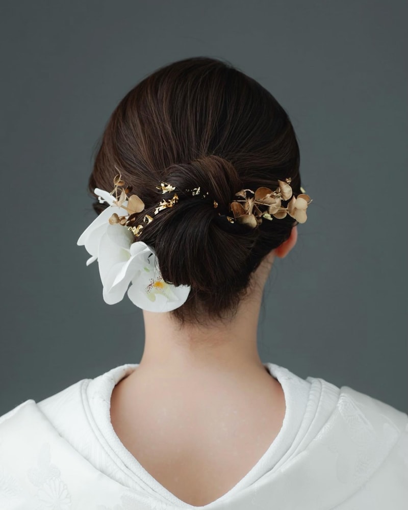 髪飾りと金箔を流れるように付けたのと、前髪をあえてうすめにして流したのがポイントです^^