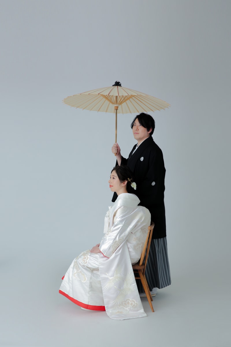 和傘も使って、和装らしいかっちりとしたお写真。 ハウススタジオでのお写真とまた雰囲気が変わります。 こちらのお客様はシンプルな白い背景でも撮影されました!ご希望あればシンプル背景で撮影も可能です!ご相談ください!
