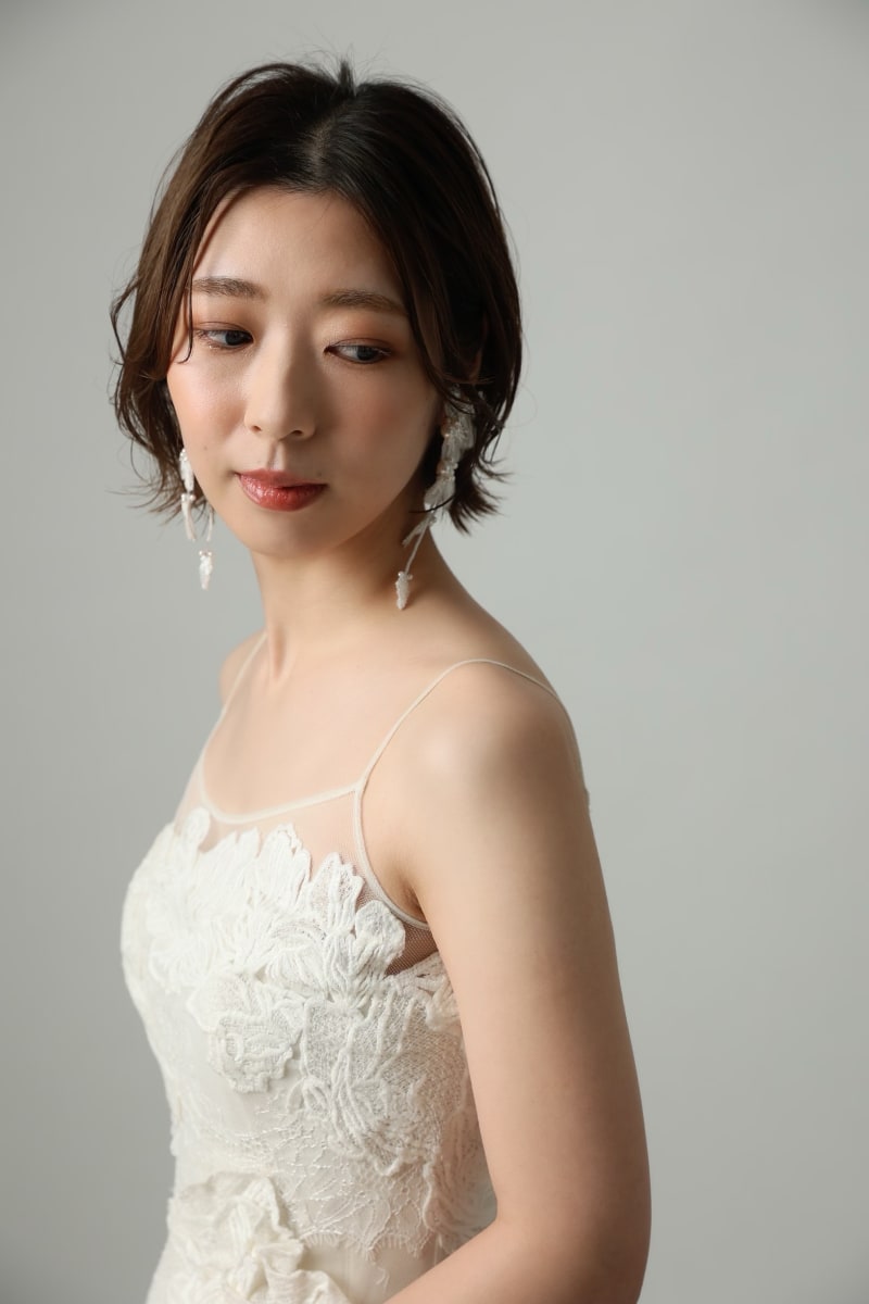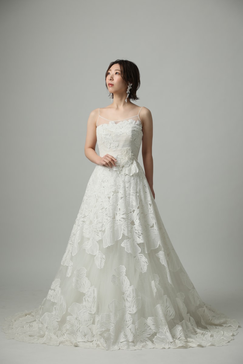 胸元がシースルーでキャミソールになっていて、全体にお花の立体刺繍が入っているAラインのドレスです。