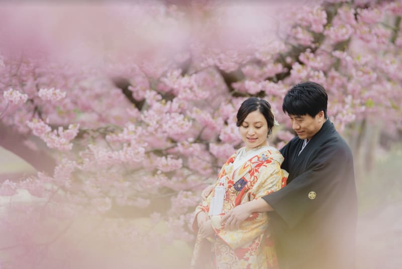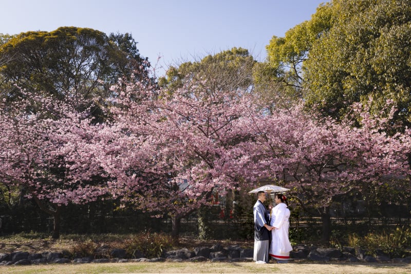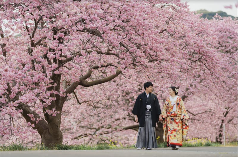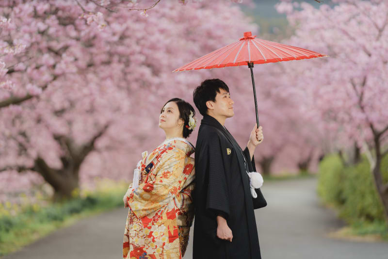 実は4月の桜シーズンに比べて、人混みを避けて撮影ができるので伊豆の河津桜は秘密のロケスポットして人気です!
