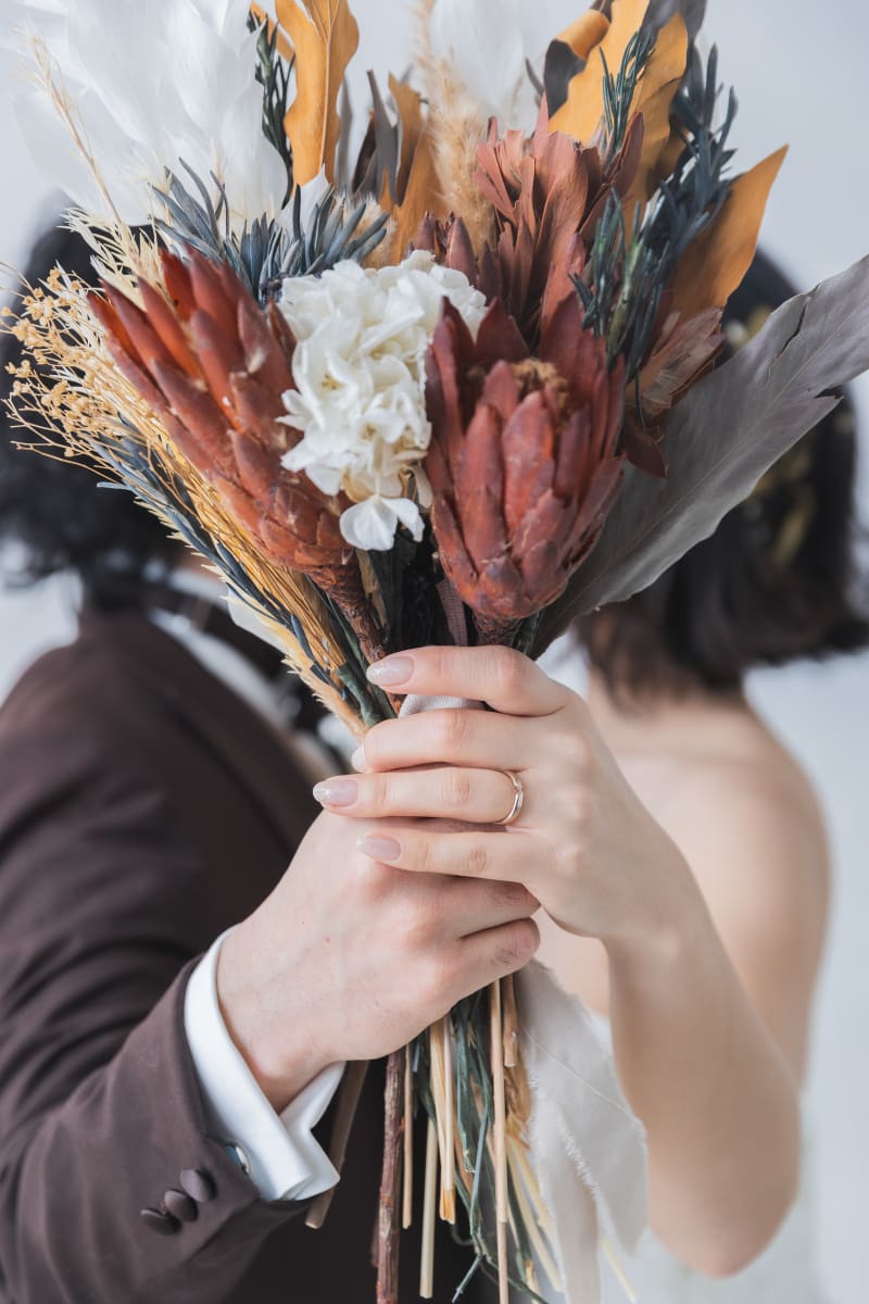 ブーケを使用しておふたりのリングをメインに。 リングのデザインもとてもオシャレで素敵ですね!