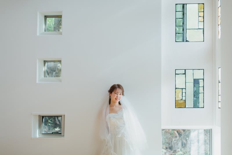 白を基調とした壁に、ステンドグラスが外光を浴びてキラキラ輝きます。