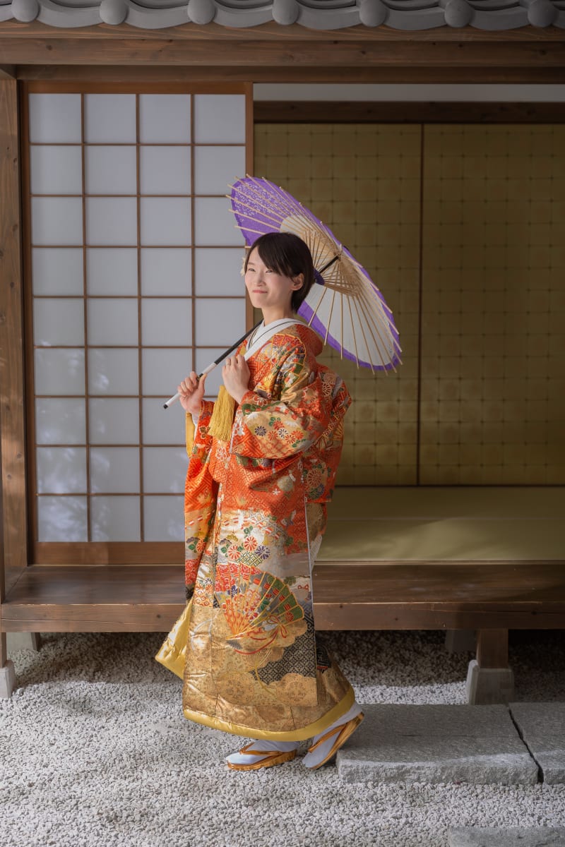 こちらは和傘を持っての新婦様のソロカット