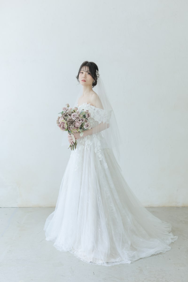 大きく施されたボタニカルモチーフのレースが華やかなオフショルダードレスで、さりげなく散りばめられたスパンコールが繊細な輝きを放ちます。