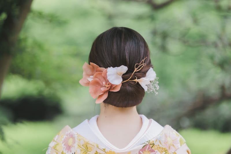 ヘアーは和装シニヨンに、ピンクの色打掛に合わせ髪飾りもピンクの胡蝶蘭とお花をつけました🌸