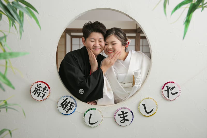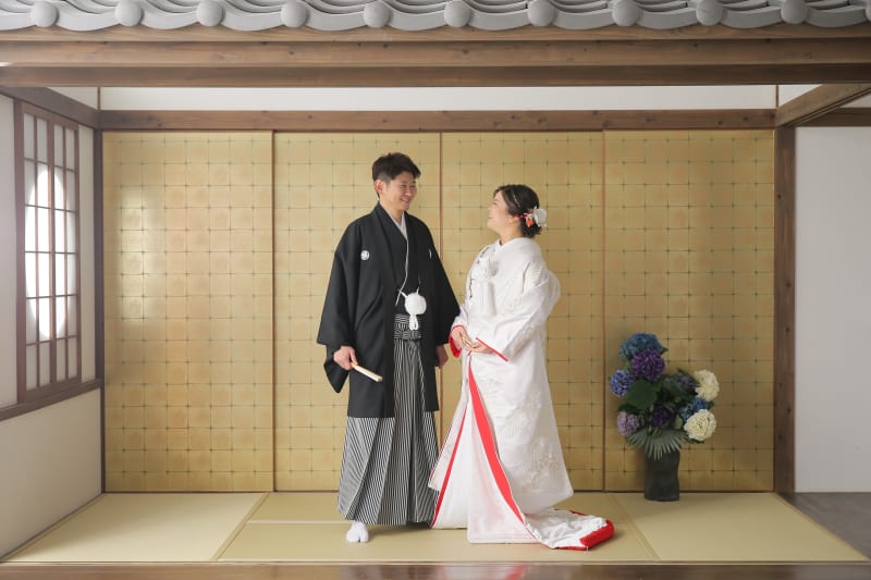 和装は赤が目を引く白無垢と、シンプルな黒紋付で。