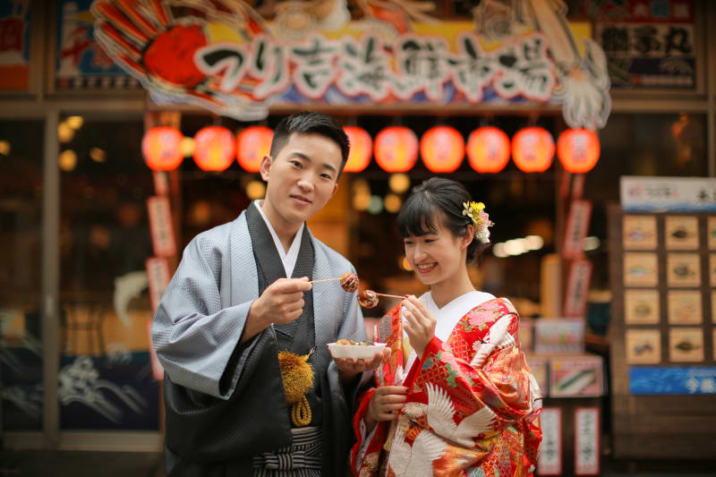 たこ焼きのような提灯が可愛いお店の前で、大阪名物のたこ焼き〜