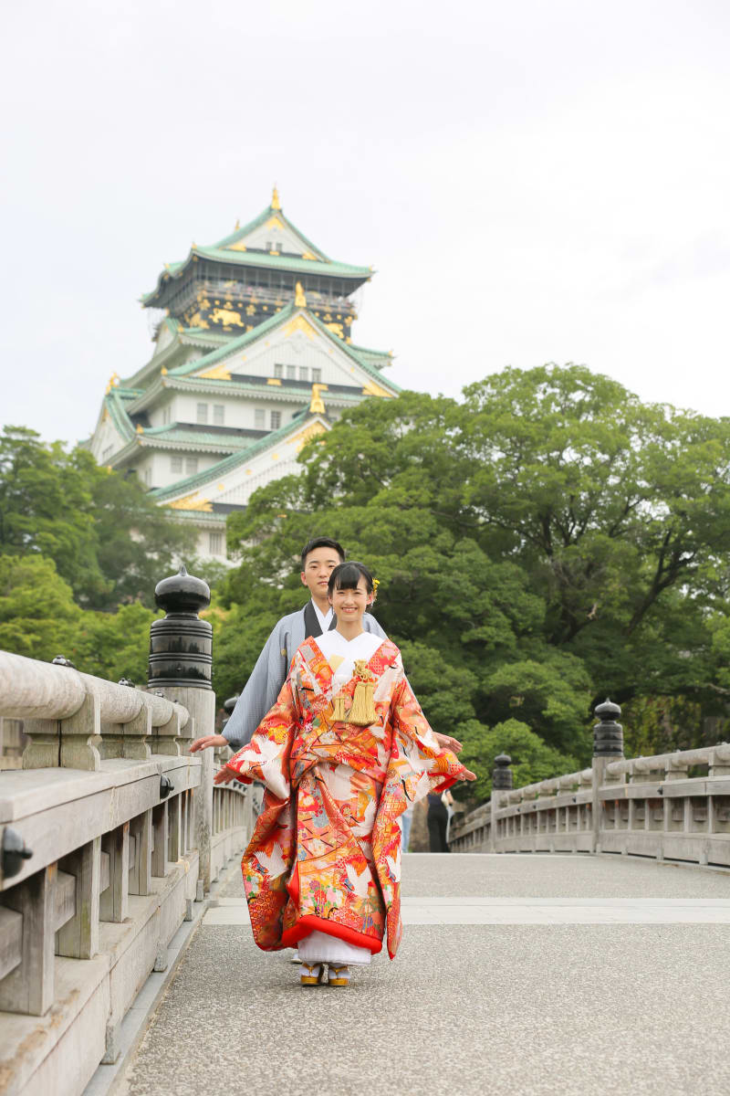 色打掛を掛け替えてタクシーに乗り、大阪城公園へ。