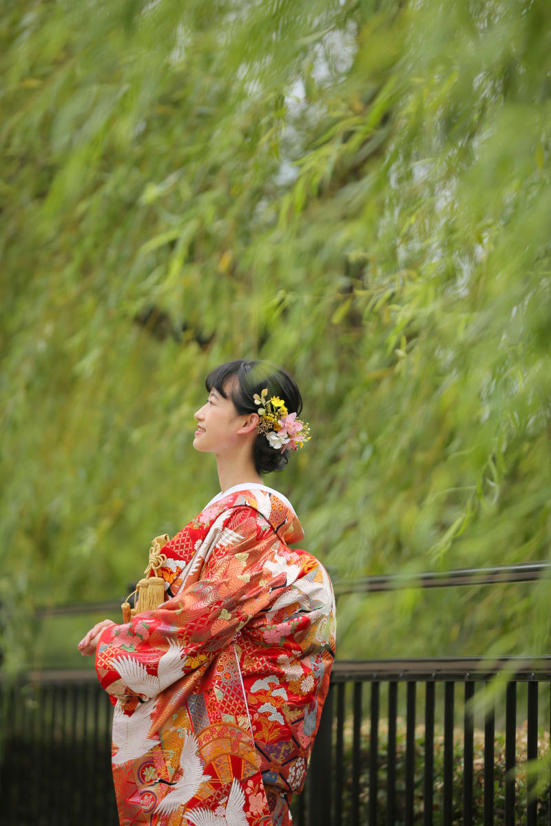 風に吹かれる柳のなかで、爽やかな表情が素敵な新婦様のソロショット。