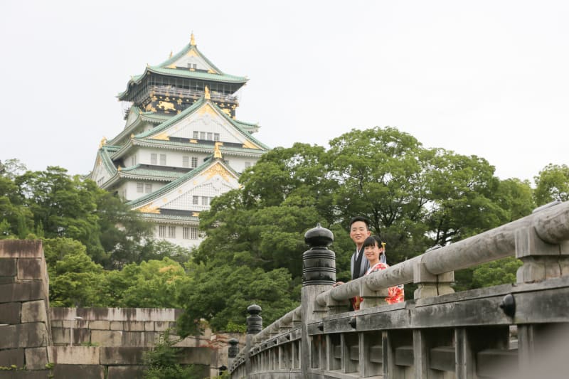 大阪城をバックに、橋の上からちらり。