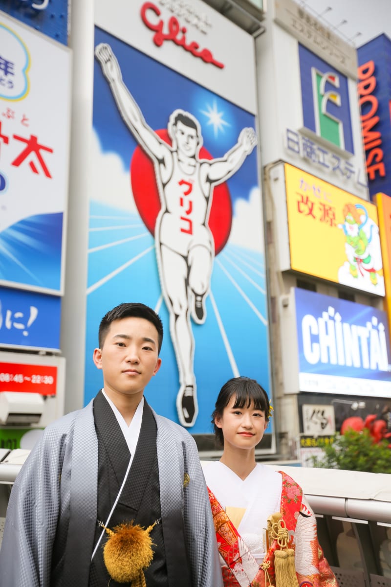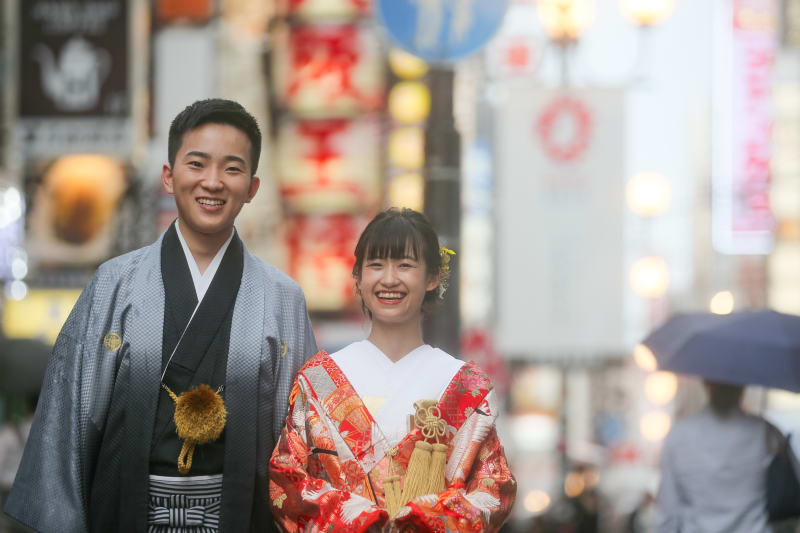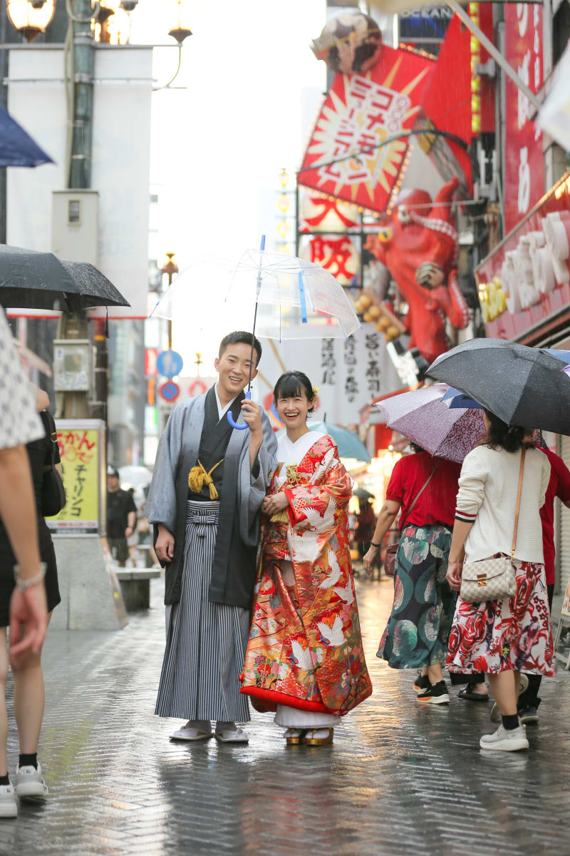 雨が弱まるのを待ってから。賑やかな道頓堀を背景に1枚。
